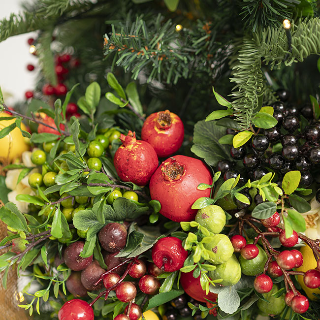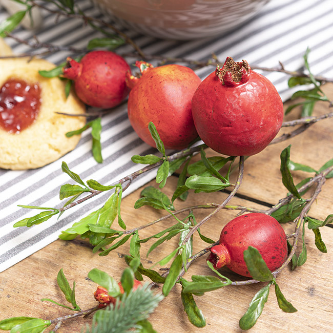In classic traditional colours of red and green, our Artificial Pomegranate Spray can be spread throughout your tree, wreaths or garlands to bring a pop of colour to your Christmas Decor. You can add it to your festive floral arrangements for an added dimension. Can also be used as a finishing touch to your Christmas hamper or gifts. Measures 78cm in height.