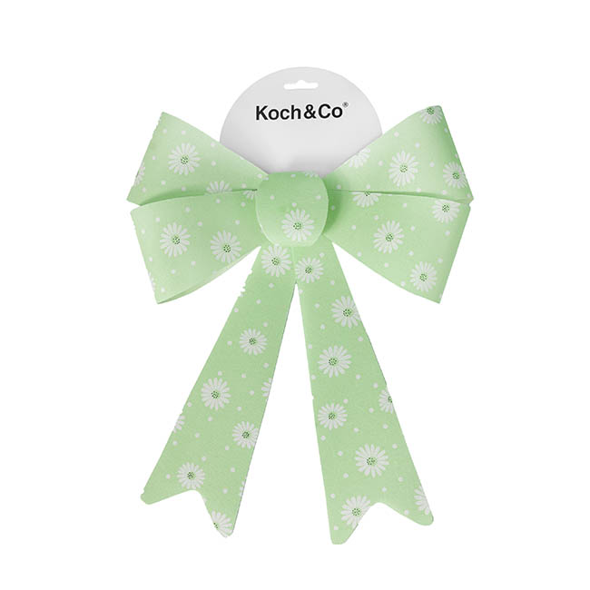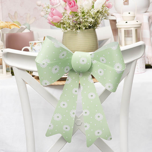 The overall width of this bow is 28cm. The overall length, from the top loop to the tail end, is 37cm. The bow loop measures 8.2cm wide at its widest point. This bow is sold individually.
