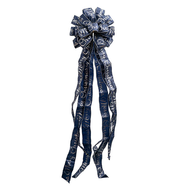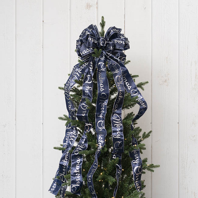 This tree topper bow features navy blue satin ribbon with silver wire edge and Silver Merry Christmas print. The ribbon is 65mm wide and has 14 loops at the top.
