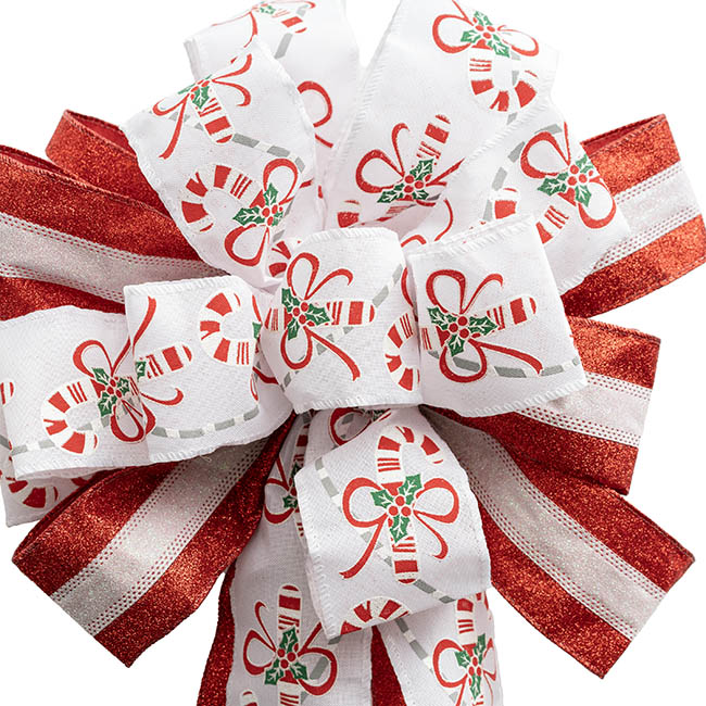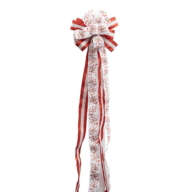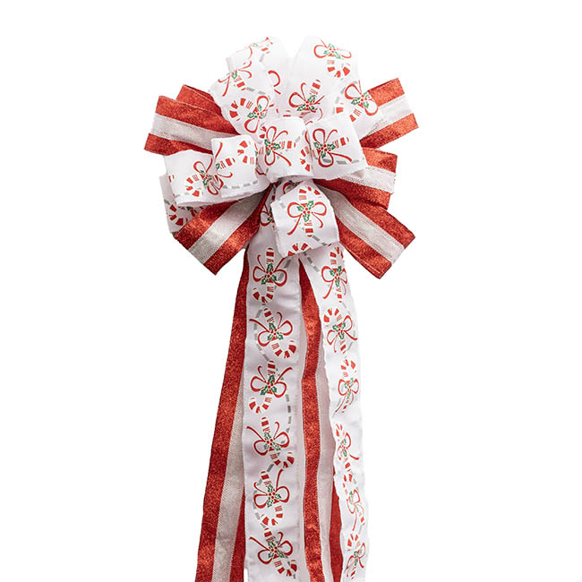 White linen ribbon with candy cane print. It has 8 loops at the top.