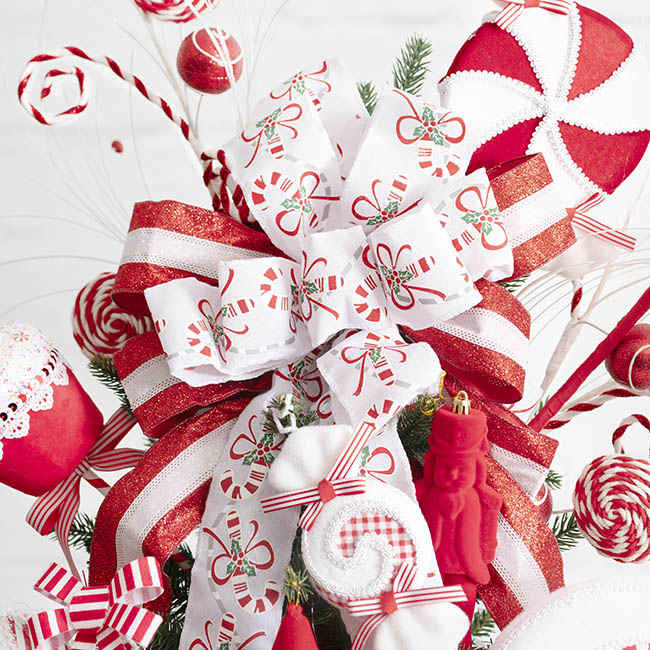 Red and white striped glitter ribbon that is 65mm wide and has 8 loops at the top.