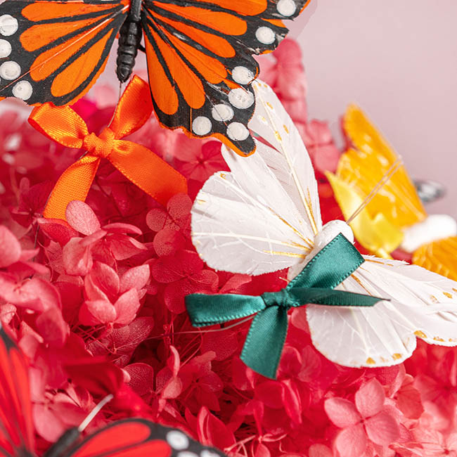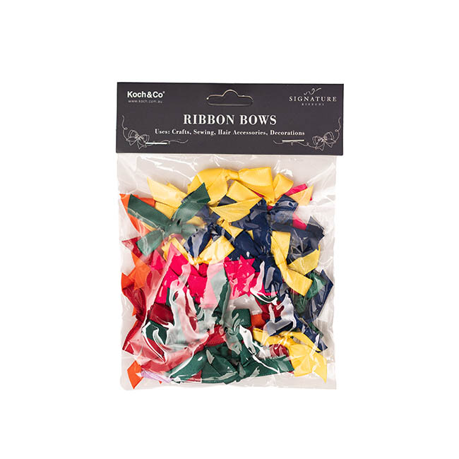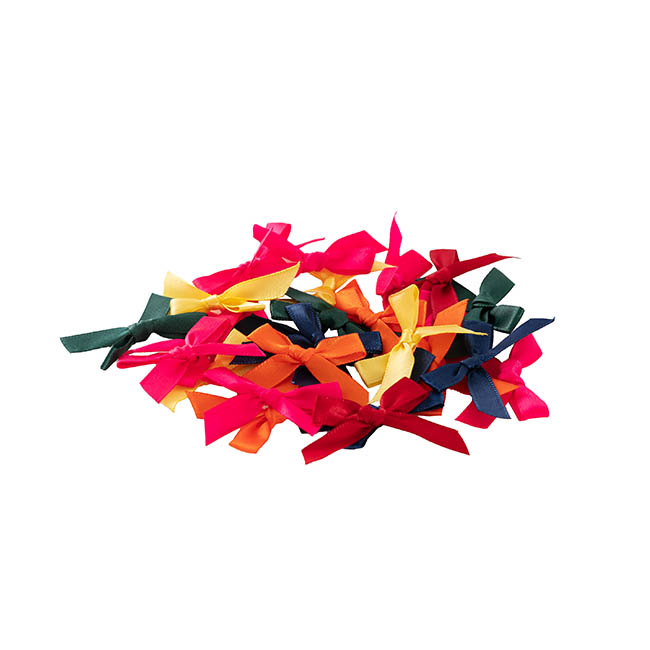 These bows are made with 10mm single-face satin ribbon. The bow loops create a 3.5cm wide bow. The tails are approximately 3cm long and can be trimmed to suit your needs. They are available in a mixed pack of 48. Colours include Deep Red/Burgundy, Dark Green, Navy, Orange, Hot Pink, and Yellow.