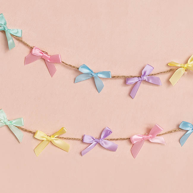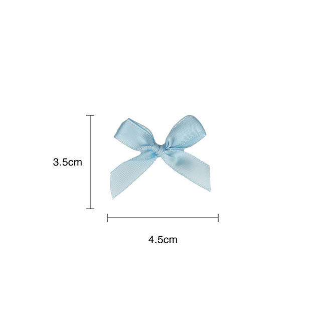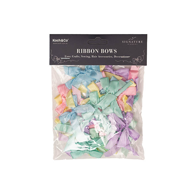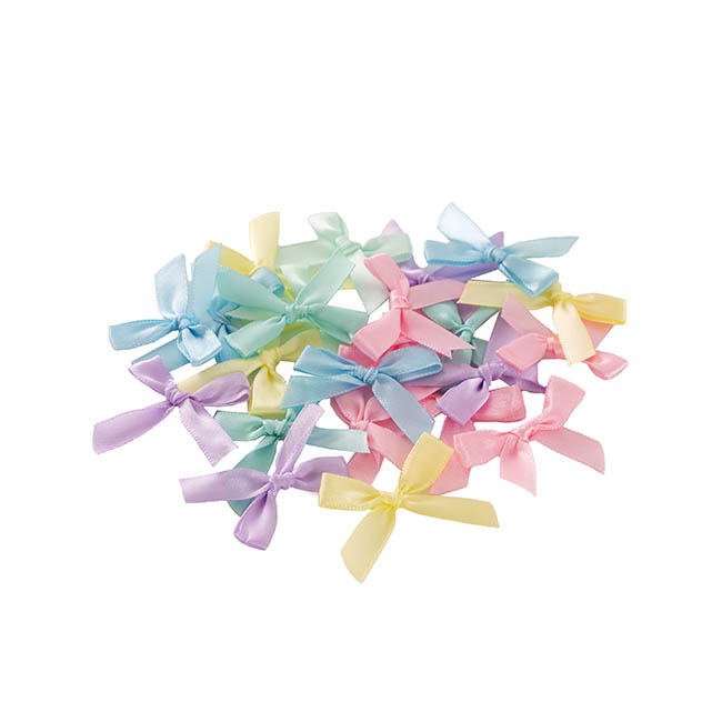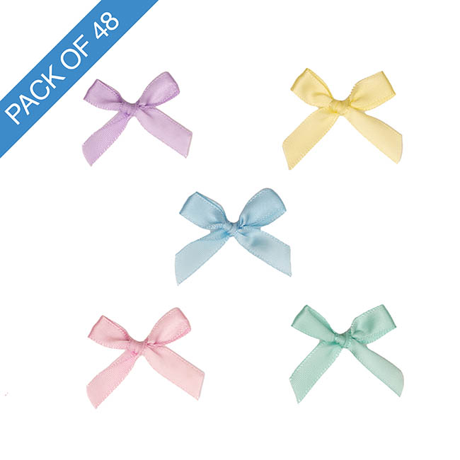 These bows are made with 10mm single-face satin ribbon. The bow loops create a 3.5cm wide bow. The tails are approximately 3cm long and can be trimmed to suit your needs. They are available in a mixed pack of 48. Colours include baby pink, baby blue, lilac, mint, aqua, and lemon.