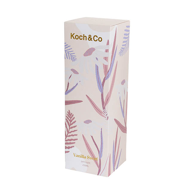 Perfect for home decor, floristry shops, or hamper gifting, this Diffuser is beautifully packaged in a botanical-themed box that is completely recyclable and plastic-free. This candle has been poured into a transparent vessel that features gold detailing.