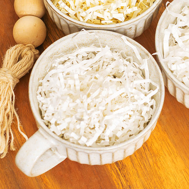 Our shred is composed of 3mm wide crinkle-cut strips and made from 80gsm paper. It is available in 150-gram bags.