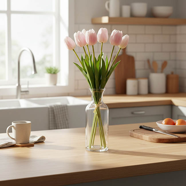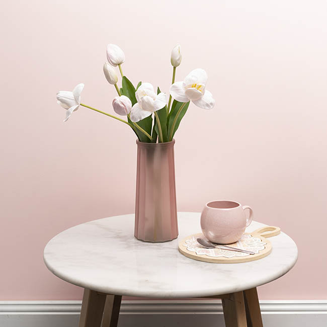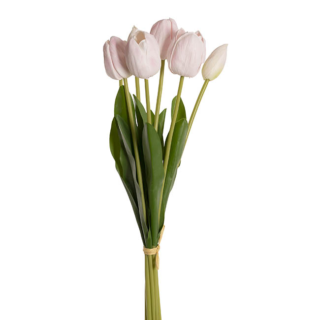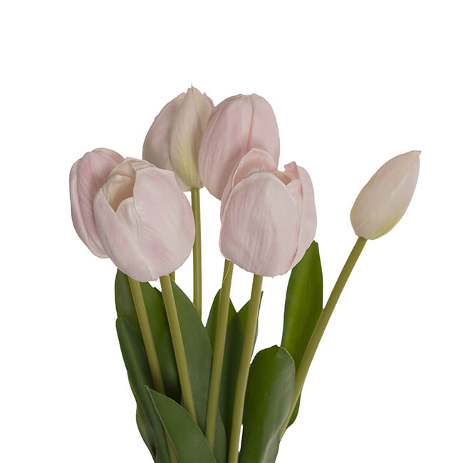 Brighten your floral styling with this real touch tulip bunch in pale pink. Measuring 49cm tall, it features seven stems with beautifully shaped flower heads, each approximately 4.5cm tall and 4cm wide, offering a soft, lifelike feel and natural finish. Perfect for vases, arrangements or event décor, this elegant bunch adds a fresh pop of colour with no maintenance required.