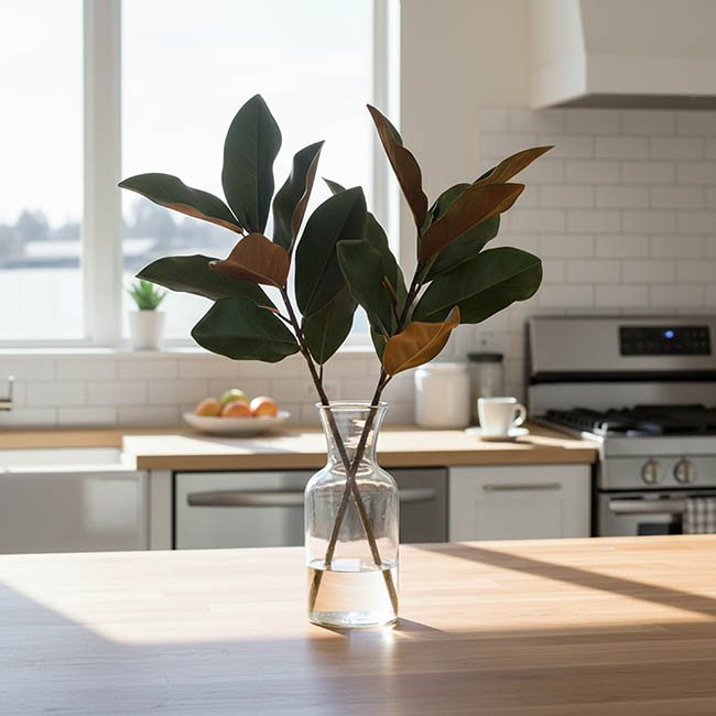 Add a natural, elegant touch to your styling with this real touch magnolia leaf spray in a fresh green finish. Measuring 60cm tall, it features beautifully detailed leaves with a lifelike texture and soft sheen, making it perfect for floral arrangements, vases, event styling or home décor. Ideal for adding fullness and greenery, this versatile spray brings lasting beauty without the need for maintenance.