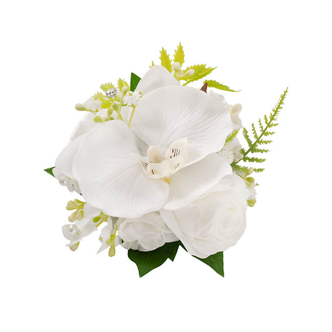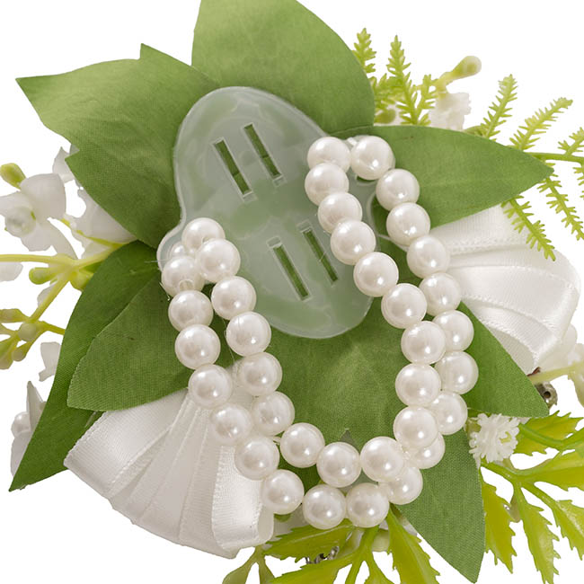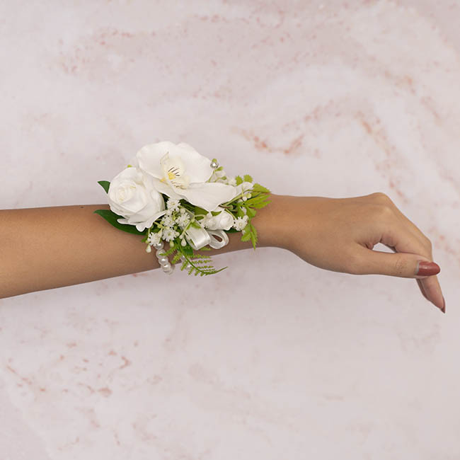 Elegant and timeless, this pre-made corsage pearl bracelet showcases real-touch roses and orchids, complemented by delicate baby's breath and mixed ferns for a naturally sophisticated look. Set on two strands of white pearl stretch bracelet, it offers a comfortable and stylish fit. Beautifully packaged in a clear corsage gift box, it's the perfect accessory for weddings, proms, and special occasions.