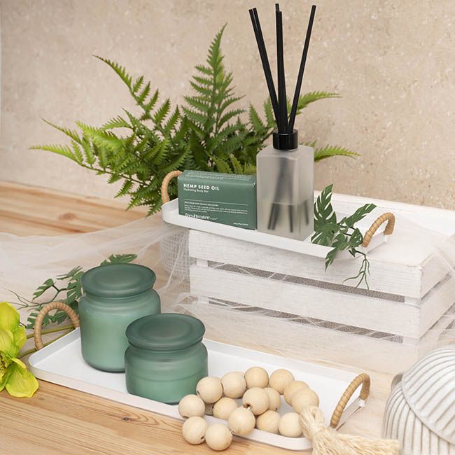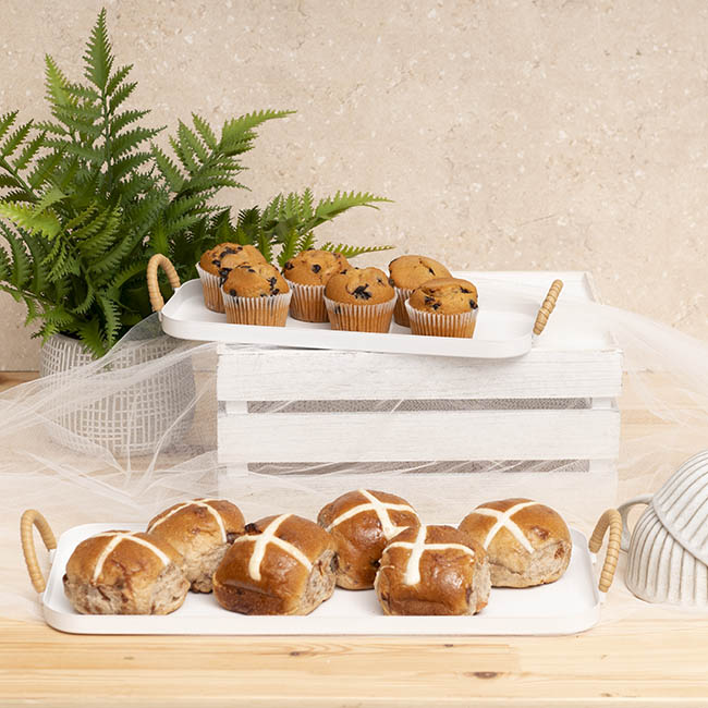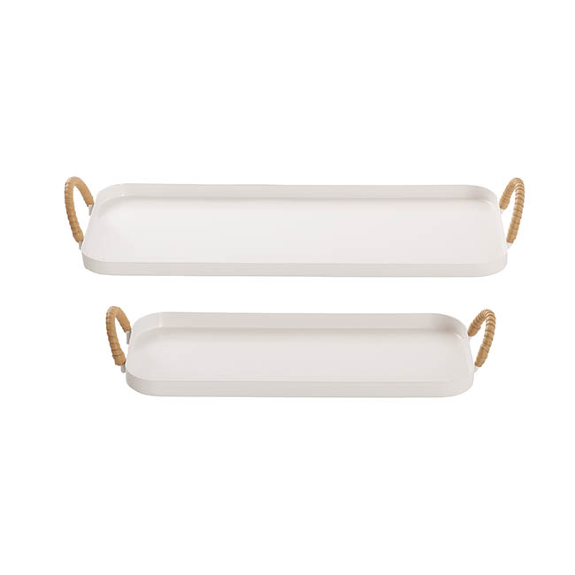 Sold in a set of two, the smaller tray measures 31.5cm long, 12cm wide, and 5.5cm tall. The larger tray measures 43cm long, 16.5cm wide, and 6cm tall.
