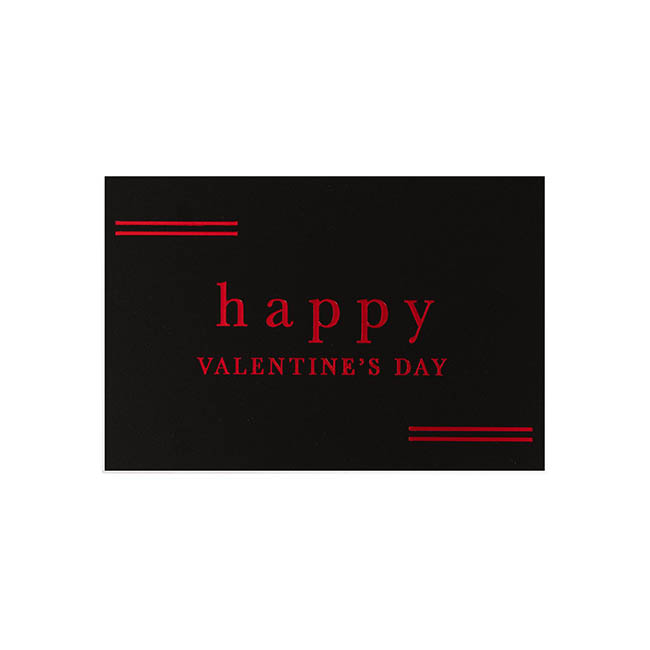 A single-sided non foldable card with black printed front and white back. It features Happy Valentine's Day message in red foil and is perfect for Valentines gift giving.