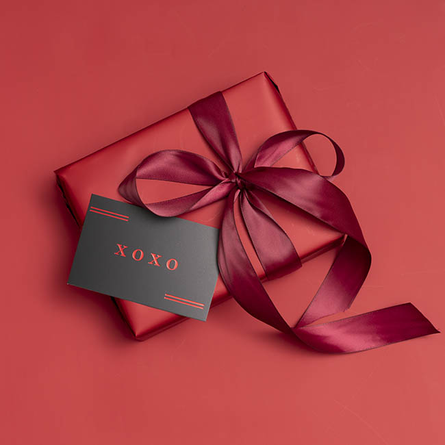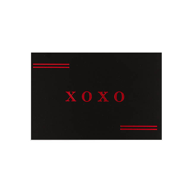 A single-sided non foldable card with black printed front and white back. It features XOXO (Kiss Hug) message in red foil.