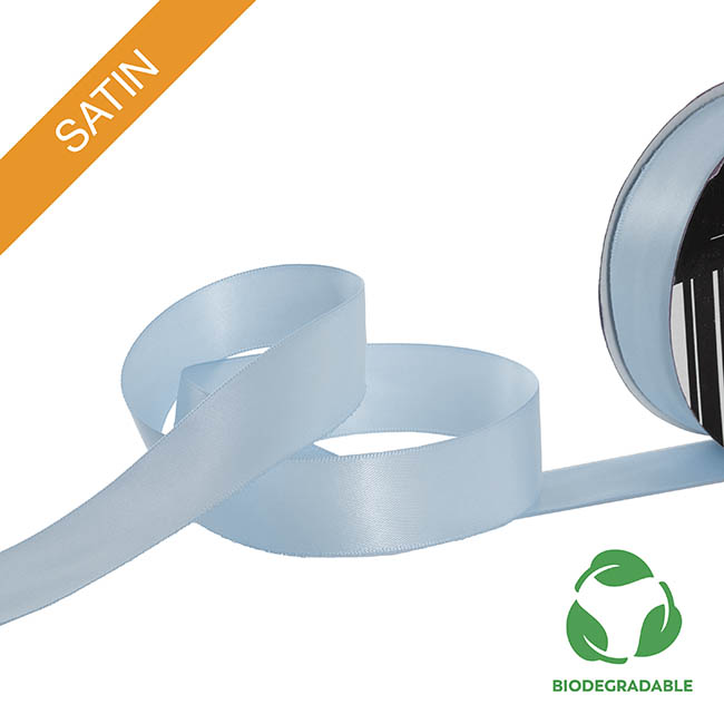 Colours: Soft Blue Ribbon Type: Biodegradable Satin Ribbon Width: Width 21 to 25mm Pack Size: Roll 25m Edge & Finish: Woven edge