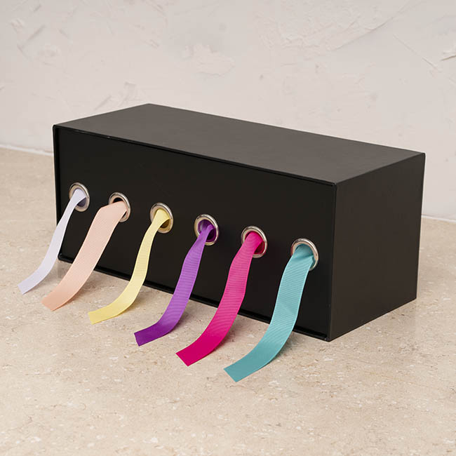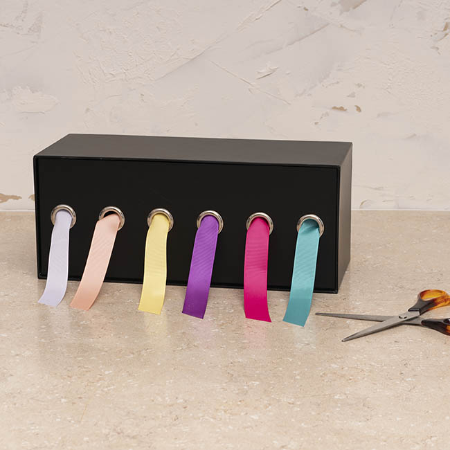 This dispenser box has the added benefit of being easy to carry and also being stackable. The ribbon storage box includes 6 holes where ribbon can be threaded through.