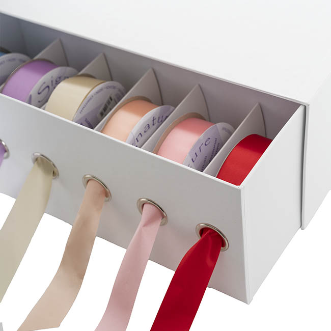 This dispenser box has the added benefit of being easy to carry and also being stackable. The ribbon storage box includes 6 holes where ribbon can be threaded through.
