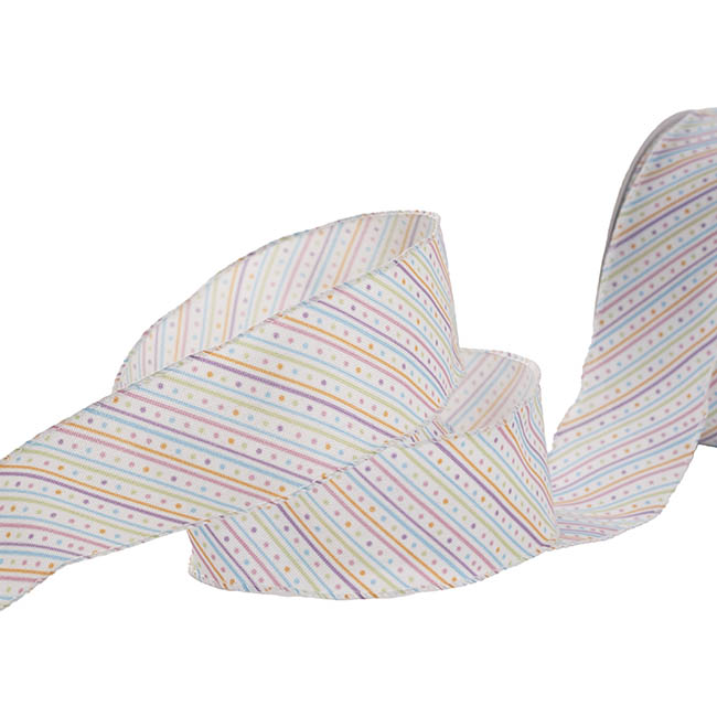 The soft pastel colours of blue, yellow, pink & lilac will be sure to dress up your floral bouquet, gift, wreath, garland, or craft project. Manufactured with wire edges, this ribbon allows for the making of full bows and bouncy curls that hold their form.