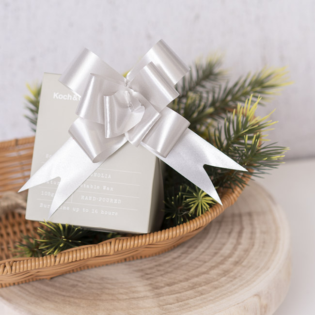 To assemble, this bow employs a simple and unique pull mechanism. Simply remove from the packaging, locate and pull the two inner narrow lengths while holding the thicker tails apart, and viola! You have a beautiful bow. The two thin tails can be used to tie to your bouquet, hamper or gift and each measure 45cm in length.