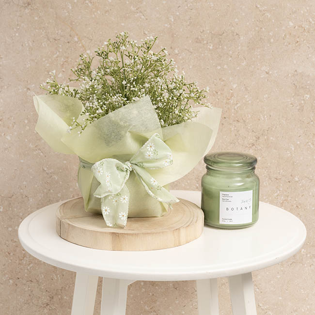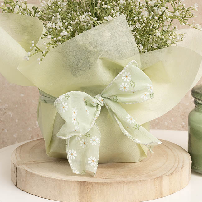 Add a touch of country, cottage, or springtime charm to your next floral bouquet with our Sheer Daisy Delight Wire Edge ribbon in Seafoam Green. Featuring a delightful white daisy print, this semi-transparent ribbon holds its shape well. Use this ribbon to create elaborate bows or to add a soft, feminine touch to any floral arrangement or wrapped gift.
