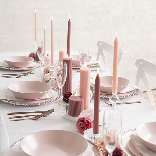 Our Roman Fluted Pillar Dinner Candle in Dusty Pink is a plain-coloured ribbed pillar candle that will bring textural interest to your event and home decor. Pair with other products from our Roman Fluted candle range for a complementary cluster. This candle is not dripless and is available in packs of 2.