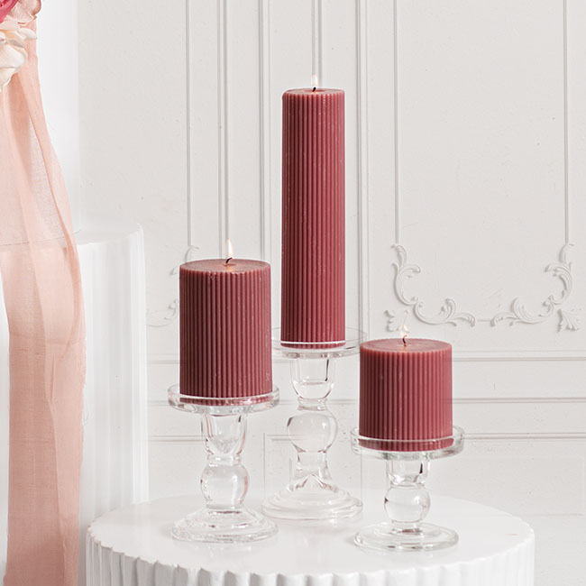 Our Roman Fluted Pillar Candle in Dusty Pink is a plain-coloured ribbed candle that will bring textural interest to your event and home decor. Pair with other products from our Roman Fluted candle range for a complementary cluster. This candle is dripless.