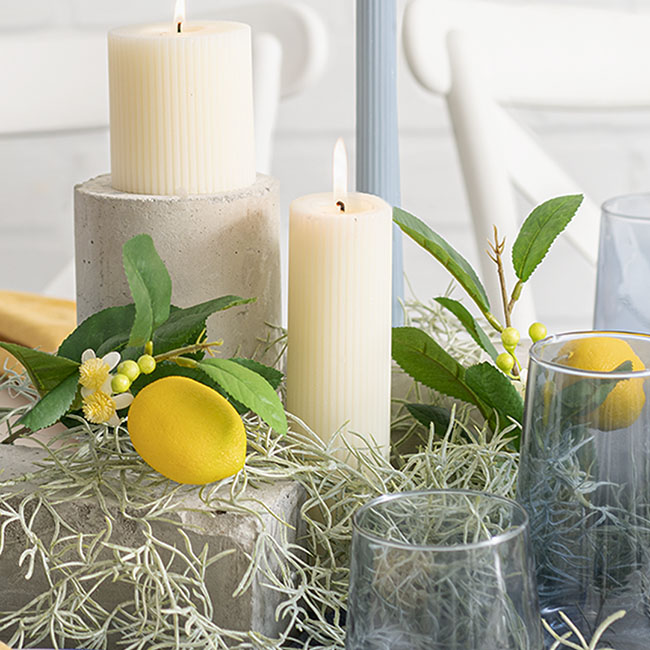 Our Roman Fluted Pillar Candle in Off-White is a plain-coloured ribbed candle that will bring textural interest to your event and home decor. Pair with other products from our Roman Fluted candle range for a complementary cluster. This candle is dripless.