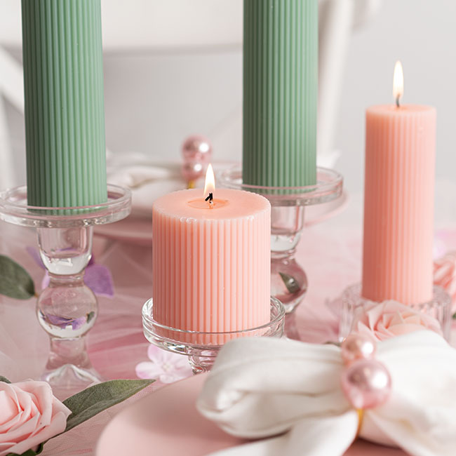 Our Roman Fluted Pillar Candle in Pale Pink is a plain-coloured ribbed candle that will bring textural interest to your event and home decor. Pair with other products from our Roman Fluted candle range for a complementary cluster. This candle is dripless.