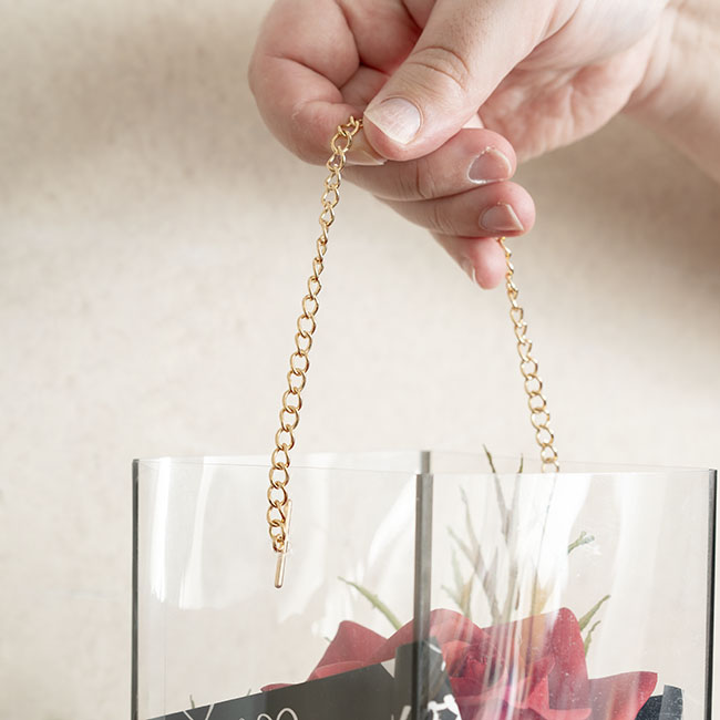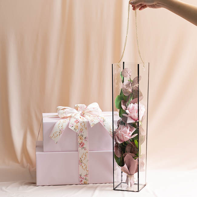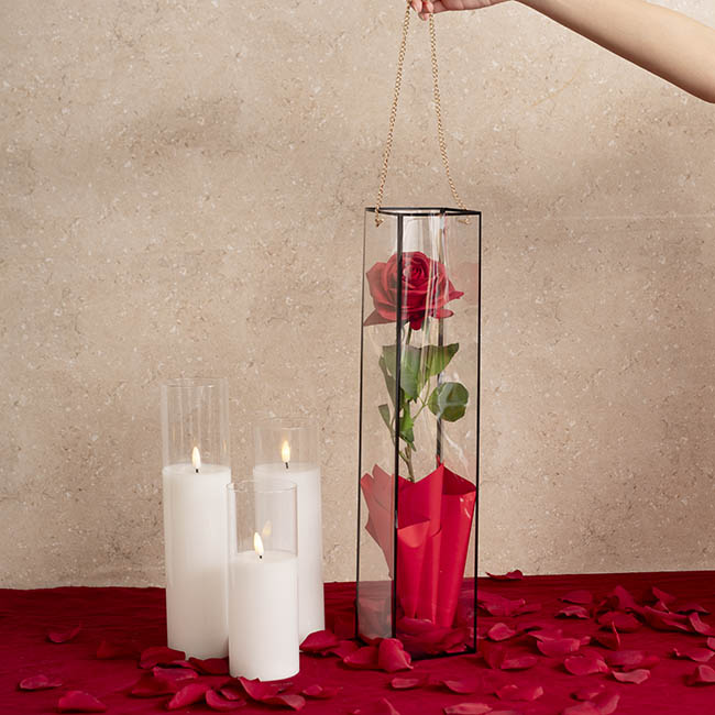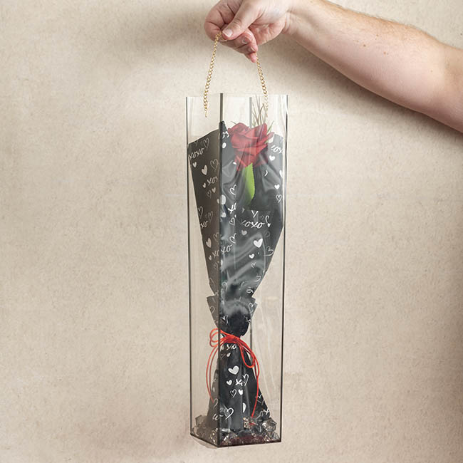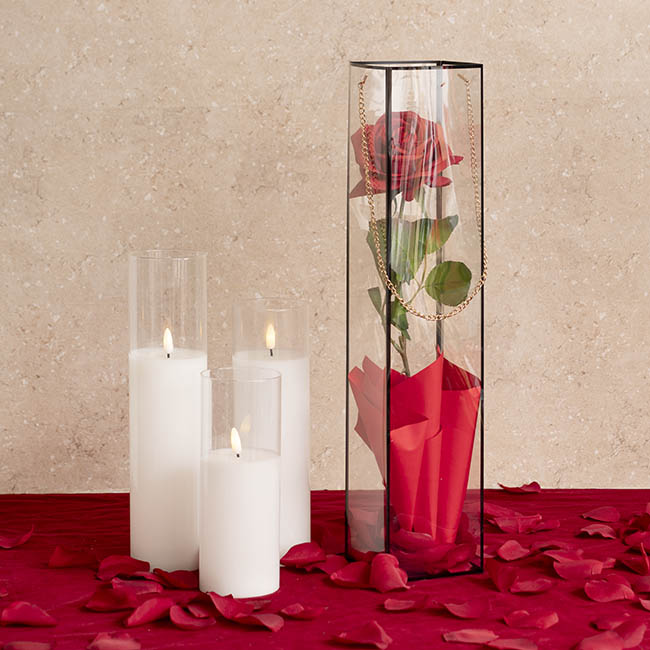 This is a lovely square cylinder for flowers, confectionary and general packaging ideas for Valentine's Day. You can use with clear cellophane shred, coloured flower wrap, crystal rocks or other decorative pebbles in the base. Beautifully displays a single rose or flower of your choice. Add a gift tag and bow and you have a perfect gift.