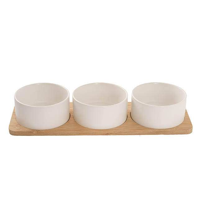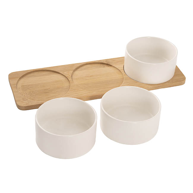 This set includes three bowls and a wooden board. Overall dimensions of this set are 36cm wide, 12cm deep, and 6cm tall.