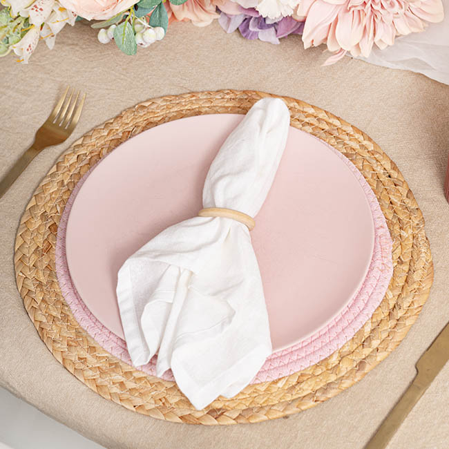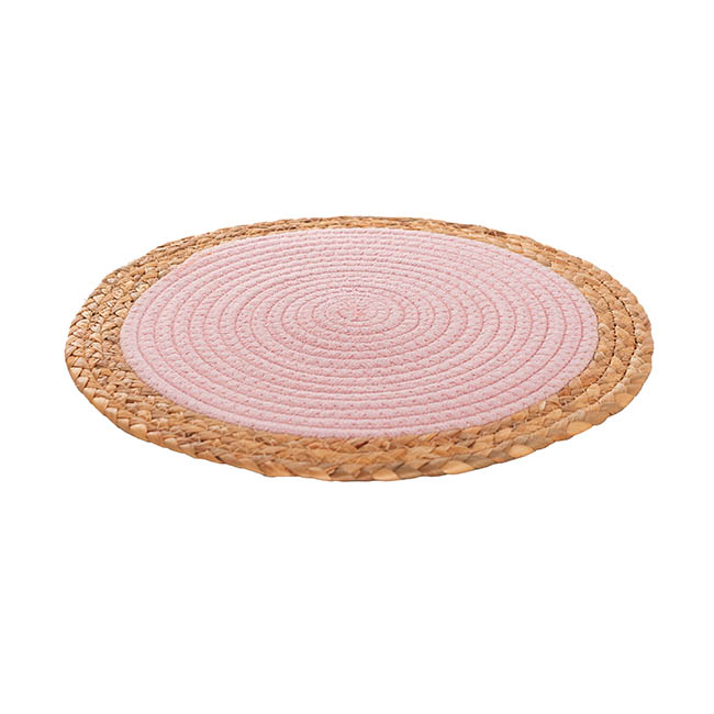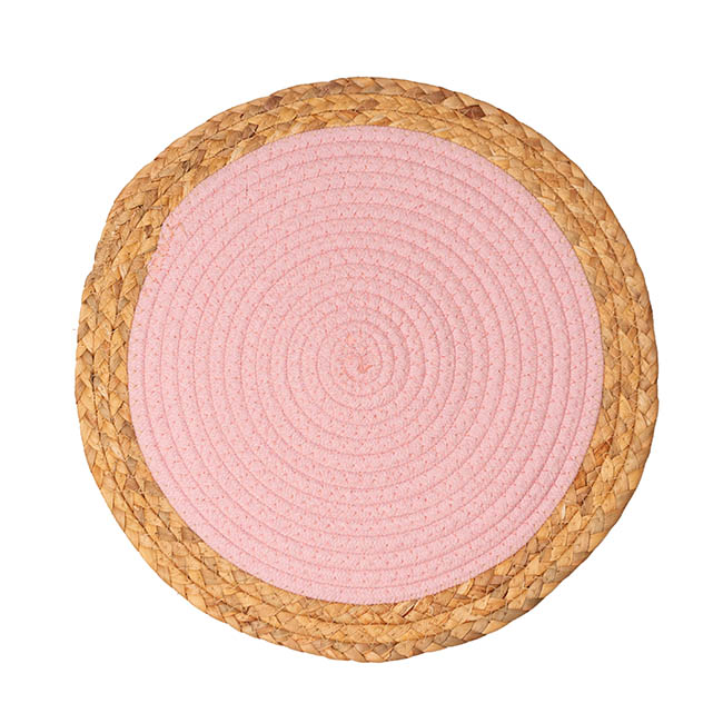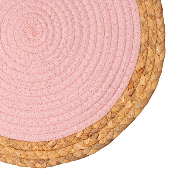 Transform your table setting with our pack of 2 round raffia placemats, beautifully crafted from pink cotton cord and featuring seagrass accents around the outer edges. Measuring 36cm in diameter, these placemats combine durability with a touch of elegance, adding a sophisticated yet natural flair to any dining occasion. Ideal for both everyday meals and special gatherings, they offer a stylish and functional enhancement to your table décor.