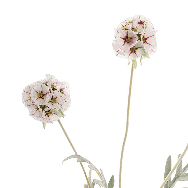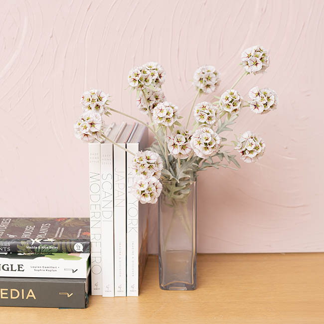 Elevate your floral styling with this elegant Scabiosa Spray in creamy white. Standing 60cm tall and featuring four beautifully textured heads, this refined stem adds softness and dimension to any arrangement. Its neutral tone makes it perfect for classic, modern, or minimalist décor, blending effortlessly with other stems while offering lasting beauty without the upkeep.