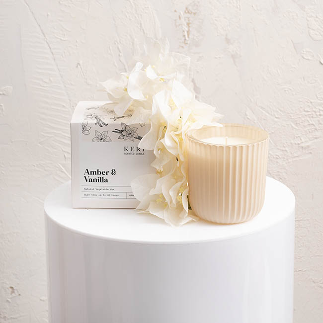 Indulge in the rich, comforting aromas of amber and vanilla with our Evelyn III Amber & Vanilla scented candle. This candle exudes a warm, inviting fragrance, with the deep, resinous notes of amber perfectly complemented by the creamy sweetness of vanilla.
