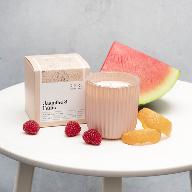 This Evelyn III Jasmine & Fruits scented candle combines the intoxicating scents of jasmine with a medley of summer fruits, creating a warm, inviting atmosphere. The floral notes are perfectly interwoven with hints of peach and apricot, offering a complex and delightful fragrance experience.