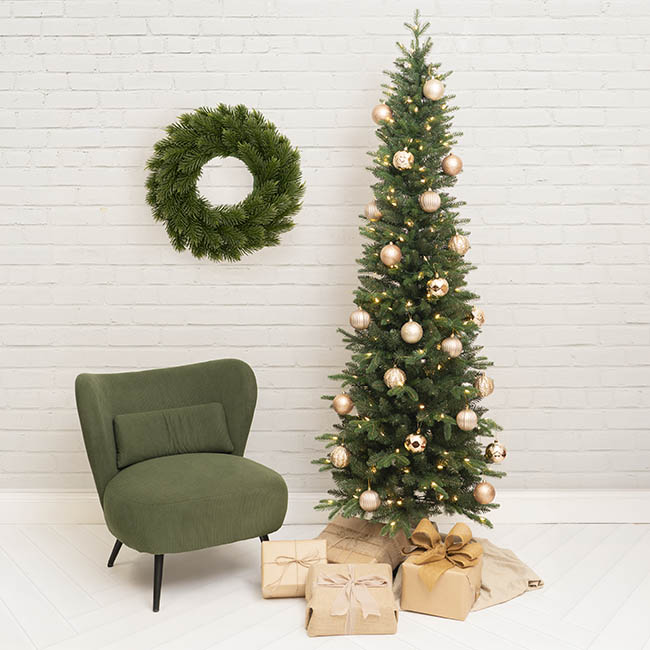 This narrow-shaped pine tree is a full tree which features over 1,000 branch tips and 210 LED lights. Most of these branch tips are wire-based, and some are Real Touch feel, with no wire base. Thanks to its narrow shape, this tree is a convenient, yet premium-looking option for more compact spaces.
