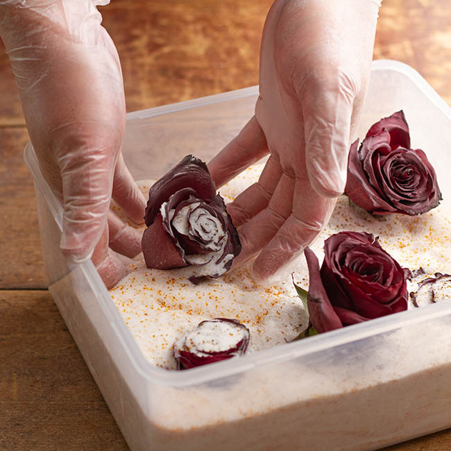 Use silica gel in an airtight container to make sure it will absorb moisture from the petals. Most flowers will dry in 36 to 48 hours. Store flowers dried with silica gel in a shadow box or airtight display case.