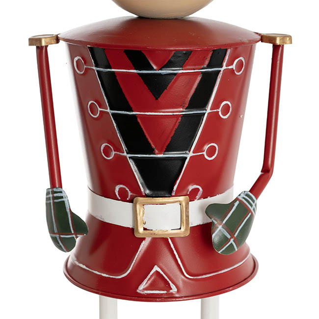 This lightweight hollow metal nutcracker combines classic charm with modern flair. His pointed dome crown features intricate gold, black, and white detailing that complements his elaborate coat. He wears plaid mittens and sports rosy cheeks along with a big, white moustache, adding a playful touch to his traditional look.
