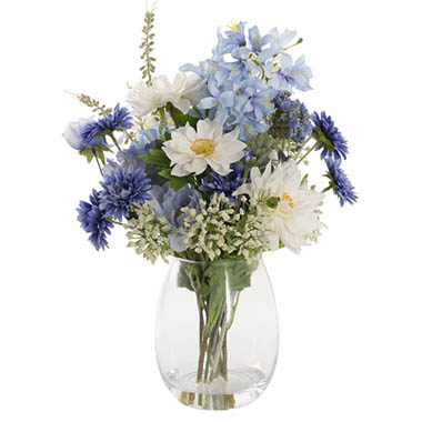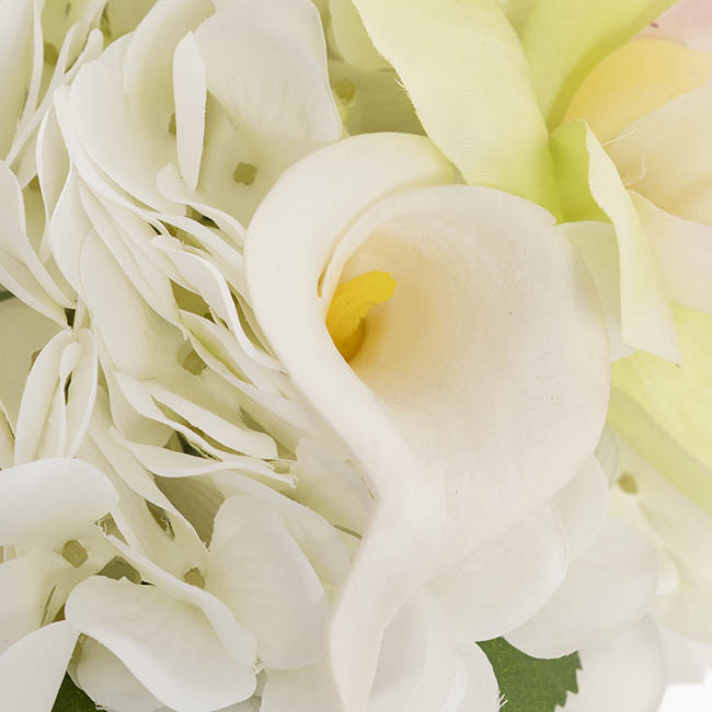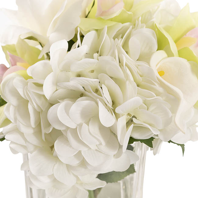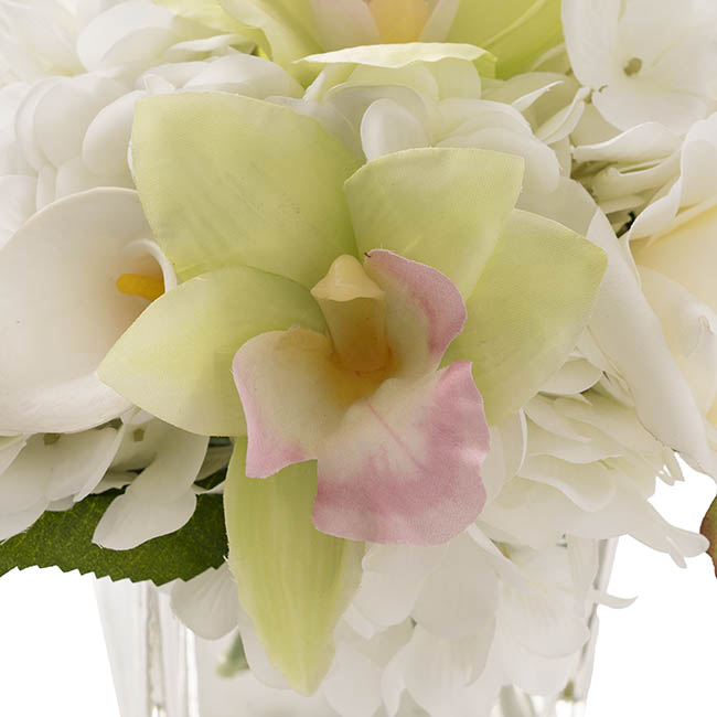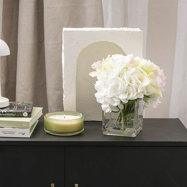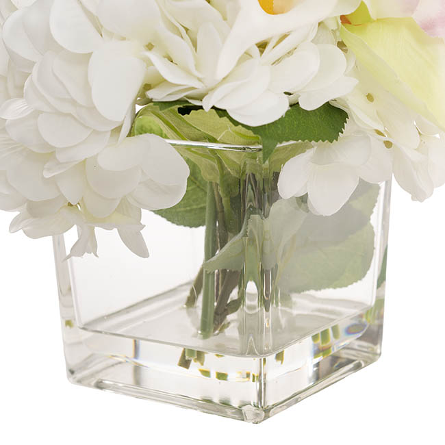 The Stella flower arrangement showcases a lush mix of nine stems featuring white and soft green roses, hydrangeas, orchids, and calla lily blooms, creating a striking and elegant display. Set in a modern square glass vase with crystal-clear resin acrylic water, it offers a lifelike, lasting finish. The vase measures 12cm tall, 12cm long, and 11cm wide—ideal for adding a touch of sophistication to any space. Some styling is required after unboxing to achieve its full, natural look.