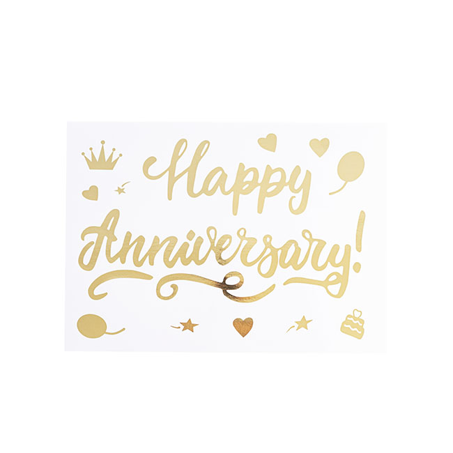 These multi-use stickers with the message ""Happy Anniversary"" in Gold, are best suited or recommended for clear bubble balloons and balloons with a wider surface. Can also be used on foil and latex balloons. Available in a pack of 10. Measuring 20cm wide x 28cm in length.
