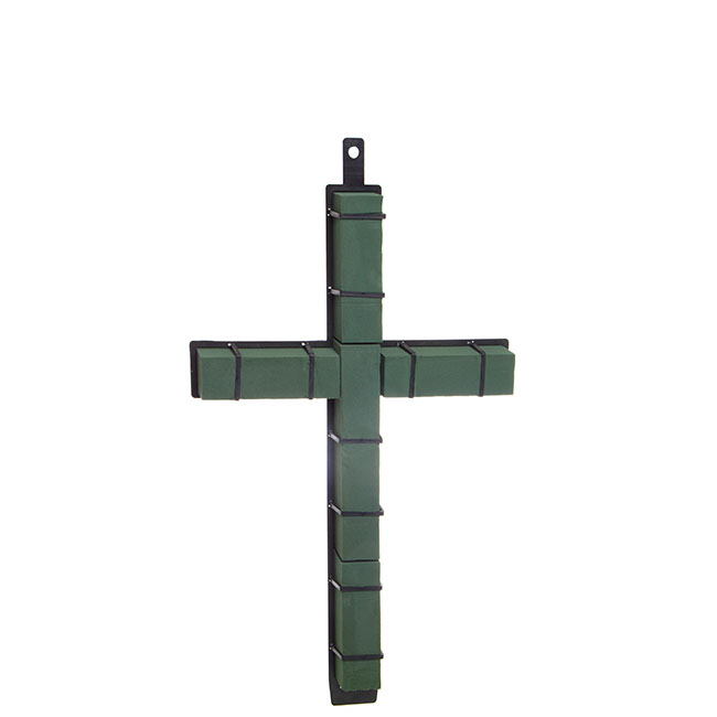 This Large Strass Cross floral foam product is popular for use at Baptisms, funerals, Holy Communions, and other religious rites of passge. This product features a strong plastic frame, and a hanging function. The plastic base has anti-slip rubber feet and a small plastic lip to support foliage and decorative ribbon. It measures 60cm high, 40cm wide, and 5cm thick.
