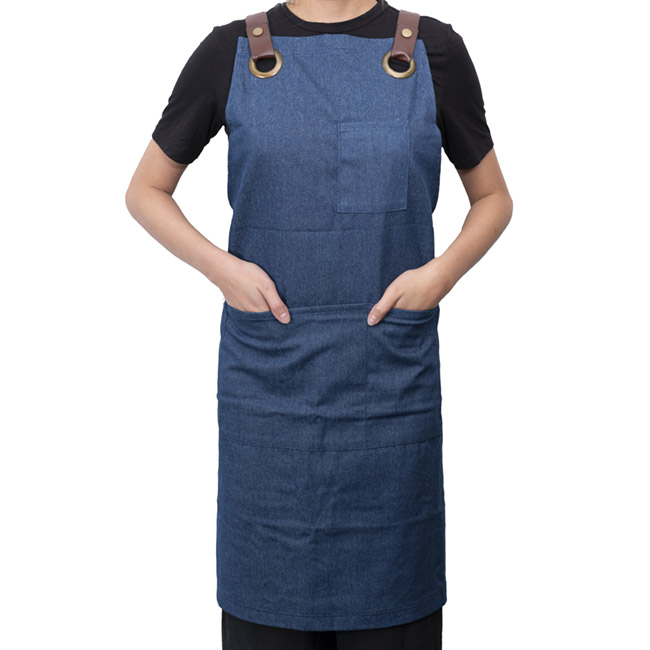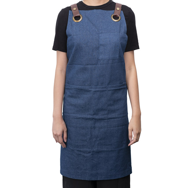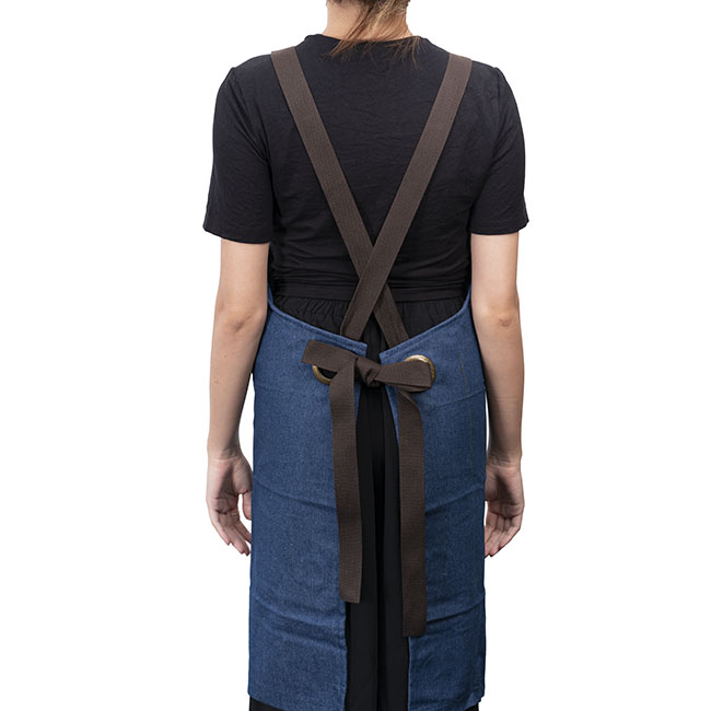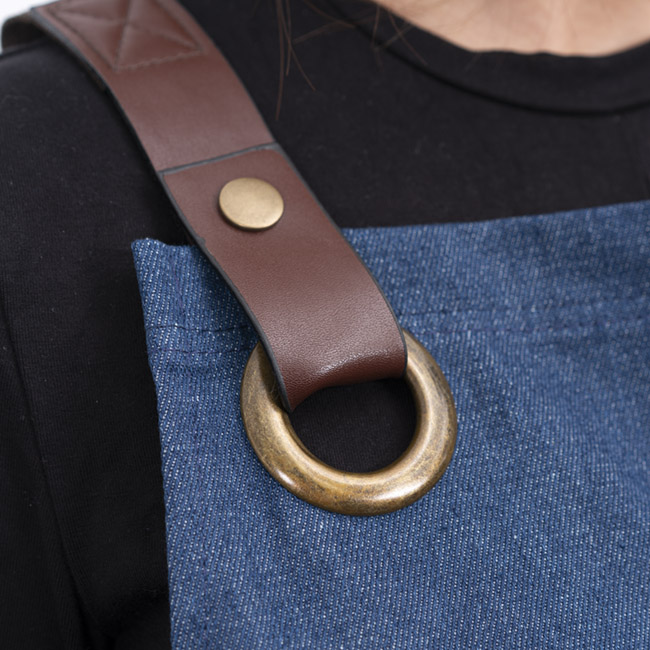 This apron is made from durable denim fabric. It has thick supportive straps that are adjustable for comfort. When wearing the apron you can choose to either crossover the back straps or leave them straight inline with your shoulders. The straps come in 2 individual straps that are leather on the top and fabric on the bottom. To use, simply feed the leather part of the strap through the front eye and secure it with the gold stud. This apron also comes in a handy drawstring bag.