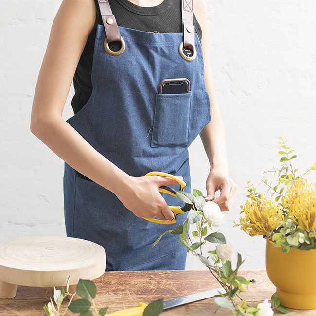 This stylish blue denim apron will keep you clean when doing your floral work. It is knee-length giving you full coverage and comes in 2 modern colours. The apron has a top pocket where you can fit your phone or pens, and 2 x handy bottom pockets for storing tools, scissors, pens, notepads etc when on the go.