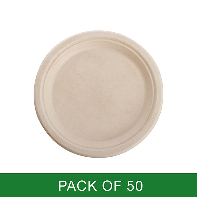 Our Sugarcane tableware is made up from 100% natural sugarcane fibre. It is food safe, oil and heat resistant up to 100 degree celsius, leakproof, microwavable and freezer safe. It is compostable and will 100% biodegrade in 90 days. This product is more environmentally friendly than recycled paper to produce. This party range includes a variety of sizes in plates and bowls, in both natural and white and is suitable to cater for all events. This dinner plate is 23cm and comes in a pack of 50.