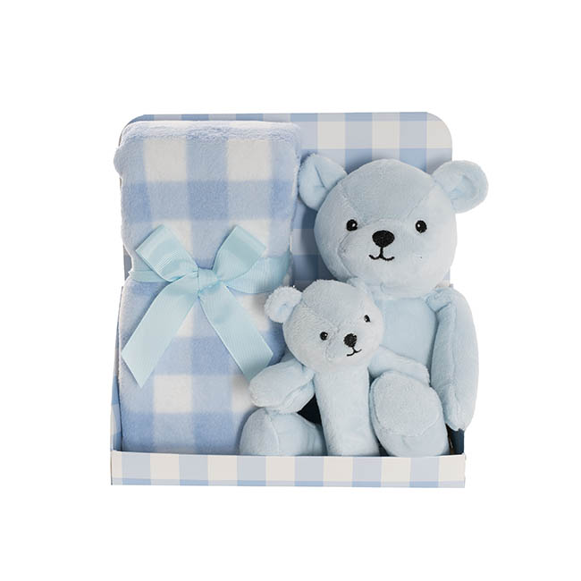 Celebrate a new arrival with this charming baby gift set, featuring Brody, a soft blue teddy paired with a matching BB stick for gentle, soothing play. Brody measures 32cm tall with a 23cm sitting height, making him the perfect cuddly friend for little ones. The set also includes a cosy fleece blanket in a classic checked pattern, measuring 90cm by 75cm. Thoughtful, comforting, and beautifully coordinated, it’s an ideal gift for newborns and new parents.