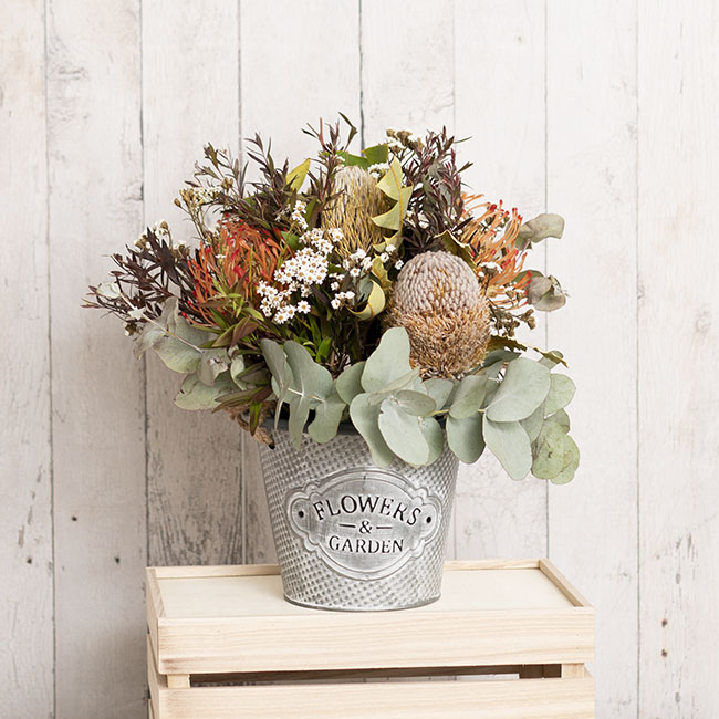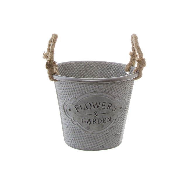This little bucket is ideal for florist arrangements and hampers. It has a zinc textured finish with an embossed label and rope handles. This makes an ideal container for themed events. The top opening diameter measures at 17.5cm. The base diameter measures at 11cm.