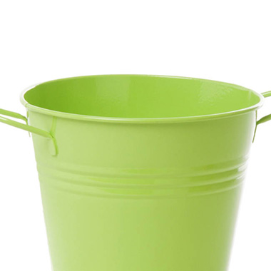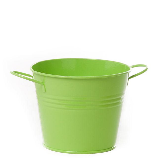 A quality decorative tin metal bucket that is powder coated in gloss finish inside and out. It has two side handles and is often used for flower arrangements. It will hold about half a brick of floral foam. Also suitable for party confectionary packaging, Easter eggs, seasonal hampers and home decoration. Top dia 15.5cm, base dia 11.1cm, 12cmH