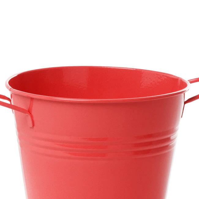 A quality decorative tin metal bucket that is powder coated in gloss finish inside and out. It has two side handles and is often used for flower arrangements. It will hold about half a brick of floral foam. Also suitable for party confectionary packaging, Easter eggs, seasonal hampers and home decoration. Top dia 15.5cm, base dia 11.1cm, 12cmH