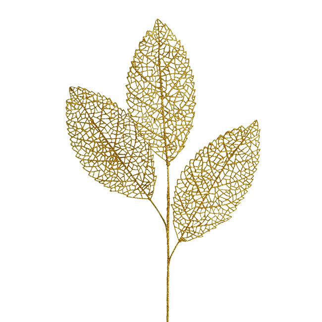 This Veined Artificial Leaf Spray in Metallic Gold features large leaves and lace-like veins. With a glimmering finish, this spray offers an easy way to build volume and add impact to your Christmas tree, wreath, garland, floral arrangement, or centrepiece.