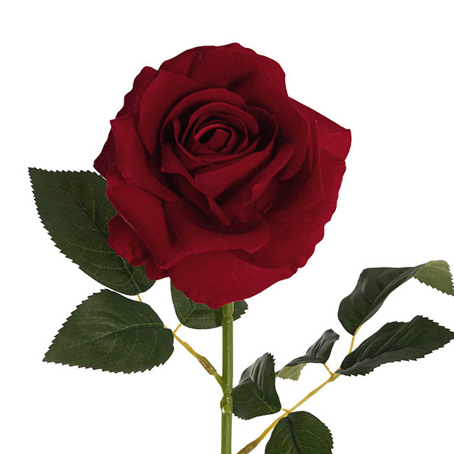 This Dark Red Velvet Rose Stem features a large, lifelike rose head. The petals have a soft, flocked velvet finish, offering a rich and luxurious texture.