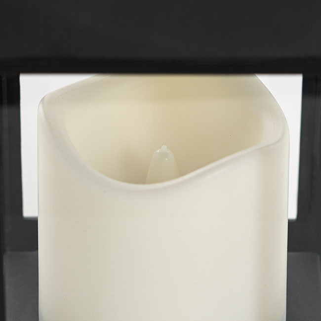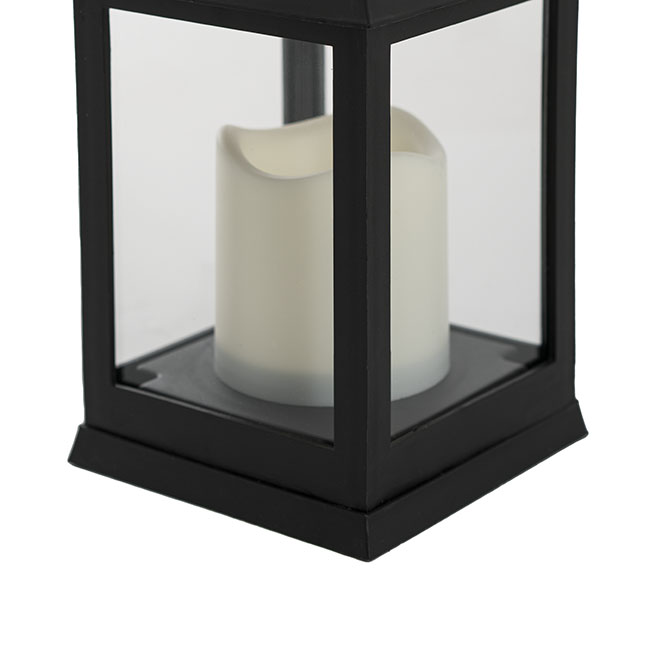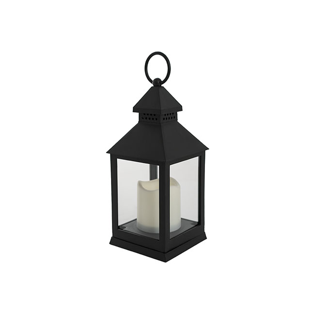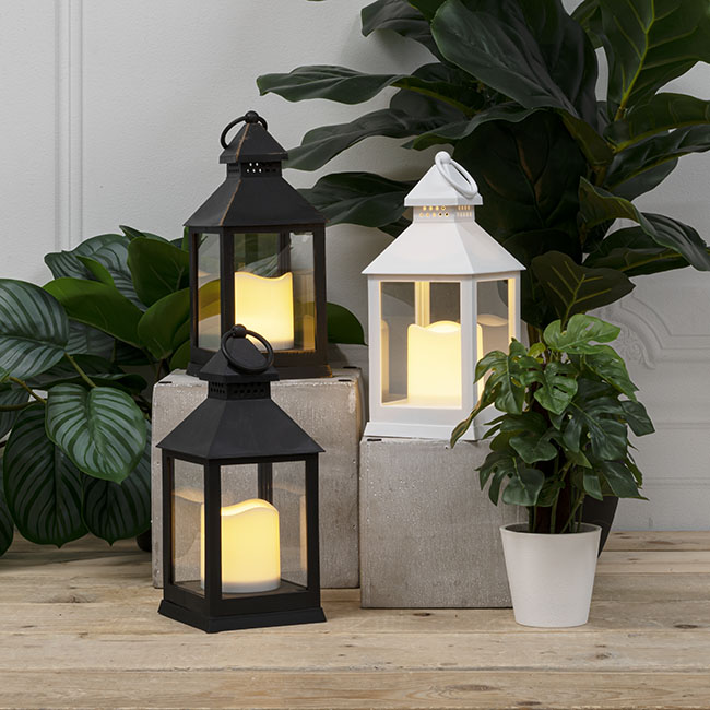 Each lantern has a sturdy ring at the top, allowing it to be easily carried or hung in place. It is made out of plastic with glass windows and requires 3 x AAA batteries to work (batteries not included).