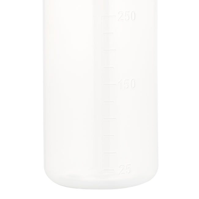 The bottle holds 250ml of liquid, has a screw-top lid, measurement indicator on the side, and bent watering outlet for easy use. We do not recommend using this squeeze bottle as a drink bottle.