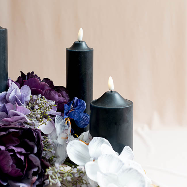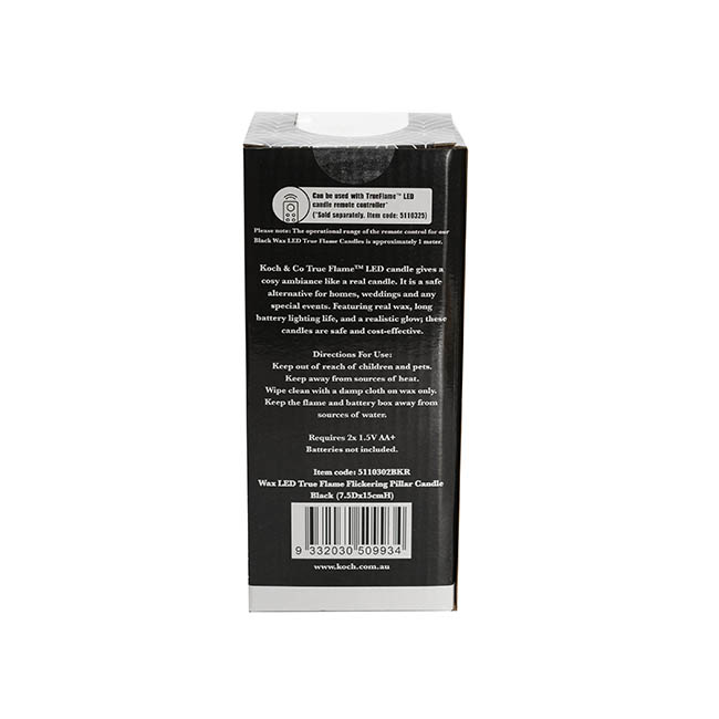 This Trueflame™ Flickering LED Black Pillar Candle gives a cosy ambiance with none of the messy wax drips, nor the fire hazard. Use this candle for a home and venue-safe alternative to traditional wax candles. This LED candle features a real wax finish, long battery life, and the realistic flameless glow that make the Trueflame™ range so popular.