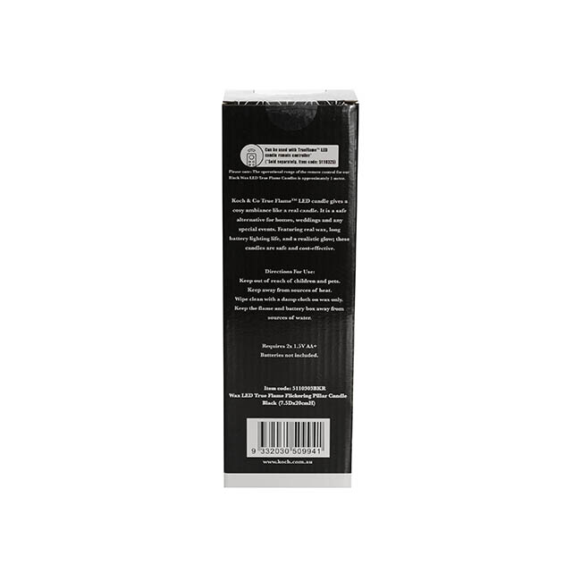 This Trueflame™ Flickering LED Black Pillar Candle gives a cosy ambiance with none of the messy wax drips, nor the fire hazard. Use this candle for a home and venue-safe alternative to traditional wax candles. This LED candle features a real wax finish, long battery life, and the realistic flameless glow that make the Trueflame™ range so popular.
